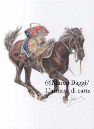 “Senza cavaliere” Destriero del 5° Reggimento Corazzieri francese, 1814. Pastelli e matite su carta.